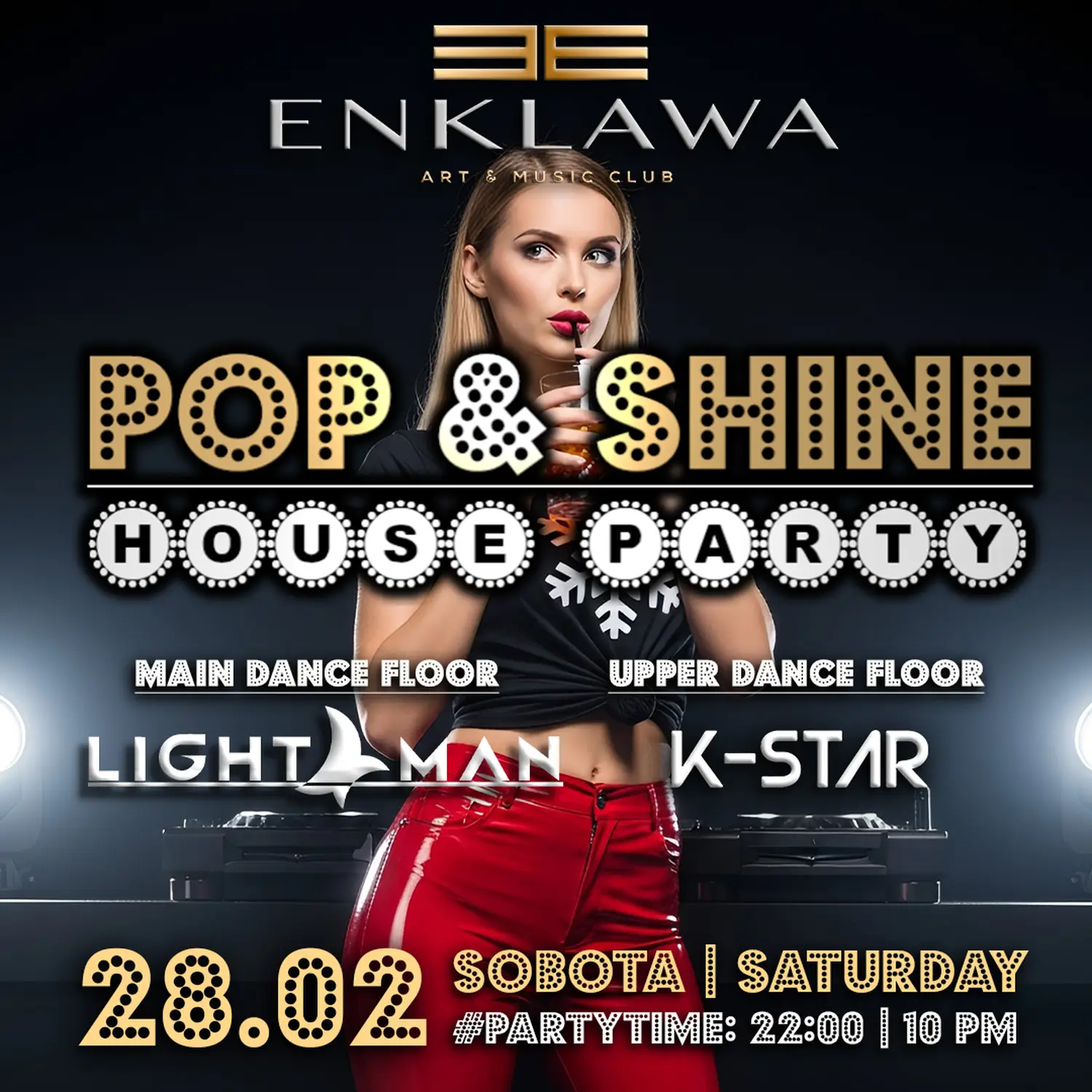 Sobota w Enklawie to zaproszenie do świata, w którym muzyka prowadzi Cię przez całą noc. Najpopularniejsze klubowe brzmienia rozświetlają główny parkiet, a piętro wyżej rozlewają się aksamitne dźwięki R’n’B, tworząc atmosferę idealną na taniec w dobrym stylu. Podczas wieczoru Pop&Shine za oprawę muzyczną odpowiadają DJ Lightman i DJ K-Star — dwóch mistrzów nocnych wibracji. Zaczynamy o 22:00. Reszta, to już historia pisana na parkiecie! #SeeYou